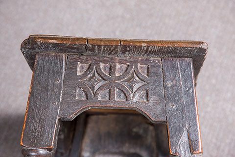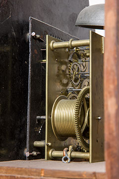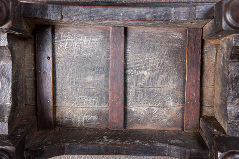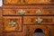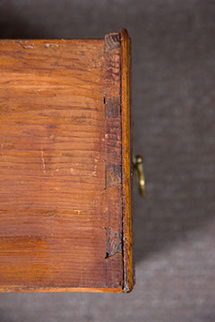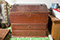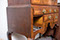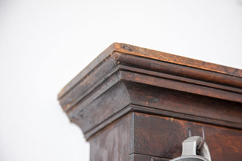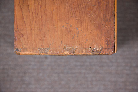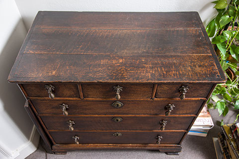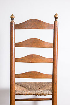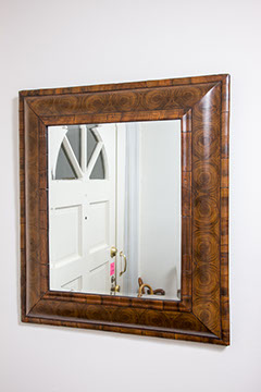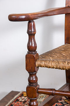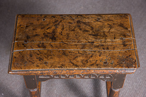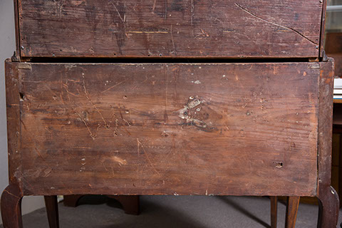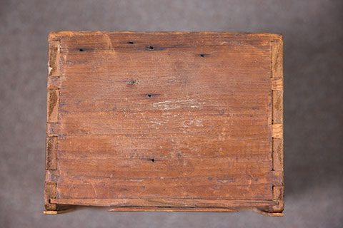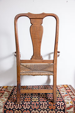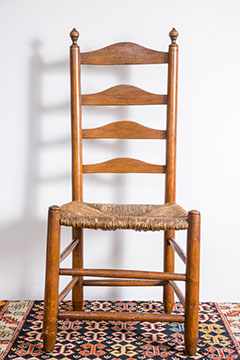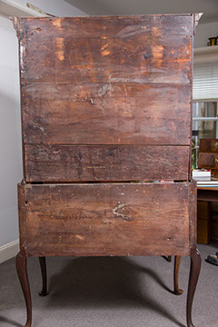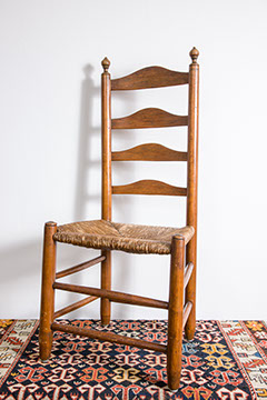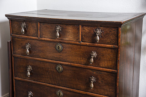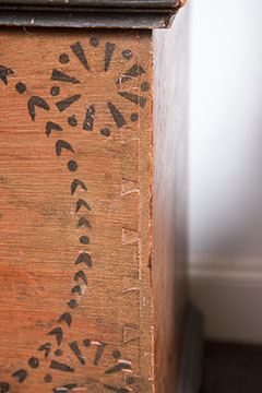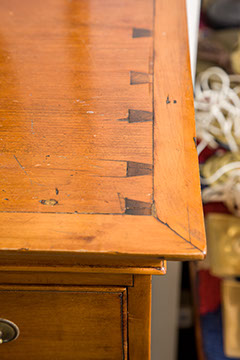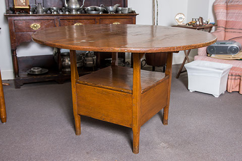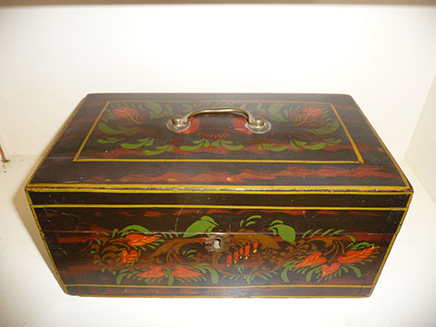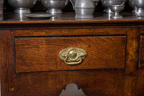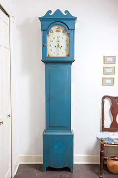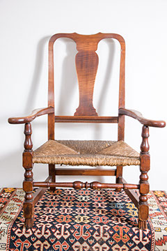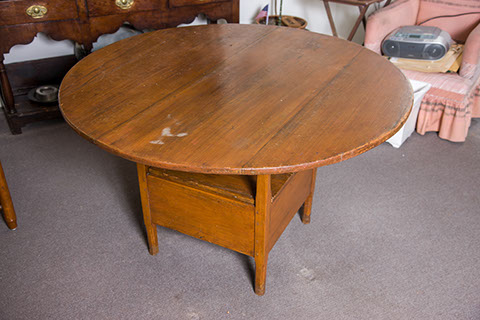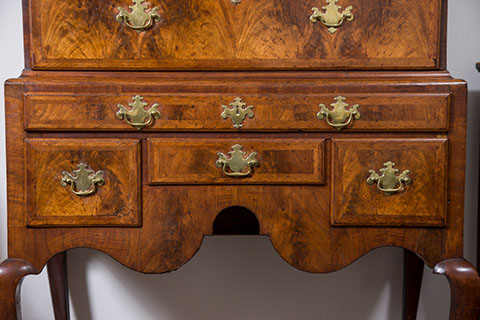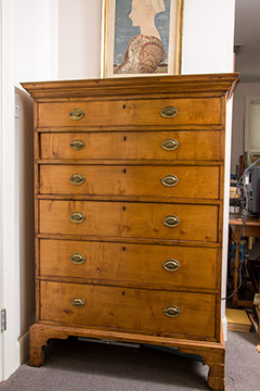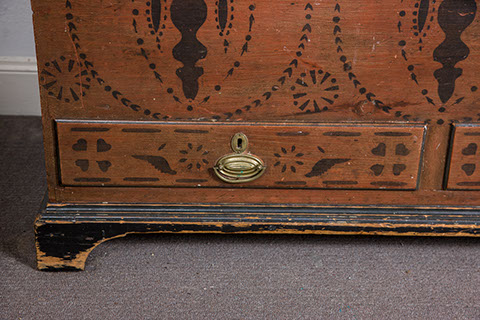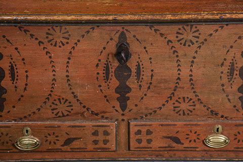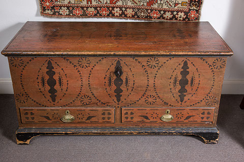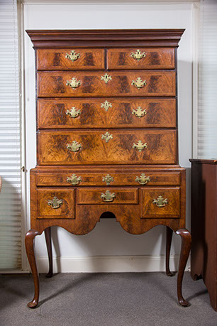 Important collection of early American and English furniture, including: Welsh step-back dresser, pot boarded, three shelf rack on dresser base with three drawers, raised on four turned legs; American Queen Anne style highboy with ‘hidden’ drawer in frieze below flat cornice, the eight drawer case has burl veneer drawer fronts, cross banded with herringbone inlay; American small table raised on chamfered legs connected by box stretcher; William and Mary style oak table with single drawer beneath a molded edge, gun barrel turned legs joined by X-stretcher and centered, with urn-shaped finial on bun feet; Connecticut Queen Anne side chair, vasiform back splat and Spanish foot; Connecticut Queen Anne side chair, vasiform back splat Spanish foot and double stretchers on the side; American fan-back Windsor arm chair, shaped and volute knuckles, with braced back and deeply carved terminals to crest rail; American Queen Anne style lowboy, molded top with string inlay and single drawer; painted blanket chest with stenciled motif, on bracket feet and two locking drawers in base; tavern table raised on turned legs with a single drawer on one end; tall case clock by William Terry of Richmond, VA in country made case, painted light blue; English “cushion” frame mirror with oyster veneering; American joint stool with blind fretwork frieze and turned legs; Shaker table on saw buck base with stretcher and center support, red paint; American painted blanket chest; American oak chest of six drawers raised on ogee feet; low work table with two drawers in frieze below top and turned legs joined by box stretchers; American Queen Anne transitional arm chair with Spanish feet; Country American maple tall chest of six drawers; English Georgian oak dressing table, three drawer carcase; American chest of six drawers on bracket feet; Cromwellian style side chair, rope turned legs and leather upholstered seat and back, with studding; Pair of American cherry cannonball twin beds; Danish Art Moderne rosewood serving cart by L. Pontoppidan; mule chest; American cherry drop leaf side table; American Pennsylvania hand painted multi-color polychrome wooden document box, c. 1850