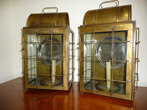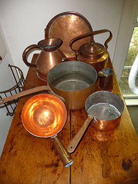 Collection of antique copper cookware, brass English fireplace fender, pair of brass wall sconces, antique lighting