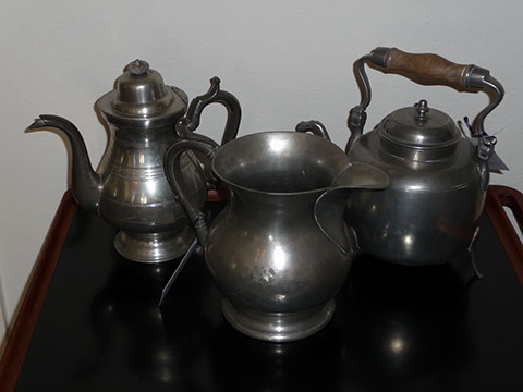 S. Orford, Allen Porter of Westbrook, Maine, G. Lingard: covered dishes; plates; pewter pitcher; pairs of matching plates; multiple sets of six matching plates in varying sizes; twelve individual cheese dishes; set of nine pap feeders; a set of ten small matching bowls; salt and pepper casters; gravy boat; funnel; pair of open sugar bowls; pint and quart measures; set of nine pint measures; tobacco box; wall sconces; tea kettle; and much more