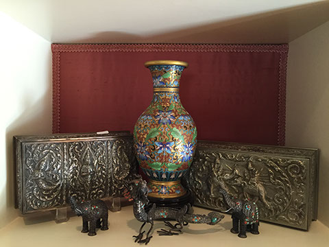 1992 Red Lexus SC300 two-door Coupe, as-is condition, you must come in person to inspect; Large Chinoiserie mirror, reputed to be from Howard Hughes estate; Orientalia; Large Cloisonné and Champleve vases, centerpiece bowls, covered bowls; Jade: bowls, small vases and jewelry; Nine panel hand painted Chinoiserie screen, 8’; Carved Chinese Camphorwood six panel screen, 18th century; ; Large framed 19th century Chinese embroidery on silk of palace officials, the subject being “wealth and riches,” silver and gold thread, signed and dated, 54”x114”; Japanese silk kimono, Chinese signed, hand painted snuff bottles; Chinese Champleve horse, 20”; Pair of Malasian puppets; Sterling silver and silverplate, to include Tiffany, Christofle; Early Chinese hand carved gilt wood kitchen god deities with human hair beards; Preserved bonsai trees; French Dore bronze clock, movement signed D’aureville, France; Cartier travel clock; Wood framed Ventian tile and glass mirror; English made bamboo furniture; Antique porcelain temple fruit; Iradj Moini Brooches; Four panel French hand painted screen; Signed Rockets basketball: Hakeem, Rudy T, among others; Antique Chinese terra cotta “Nodder;” Vintage cameras with leather carrying case; Antique boxes to include Signed Russian boxes; Antique hand carved box housing a set of opium scales; Cinnabar box; English lap desks; Antique bone inlaid boxes; Victorian three tiered wire plant stand Pair of Antique Chinese roof tiles, Afghan children’s hats; Gold and silver Maharaja parasol; Authentic zebra-skin rug, backed and edged; Cast concrete Corinthian style table base with beveled glass top; Cookbooks; Grandmother’s toy room.
