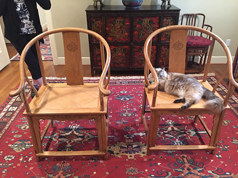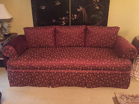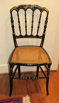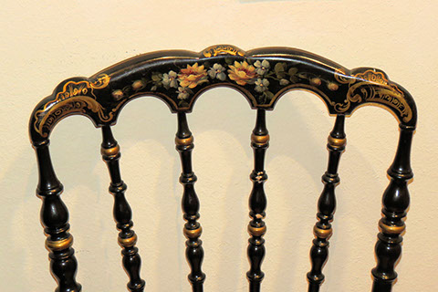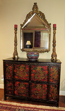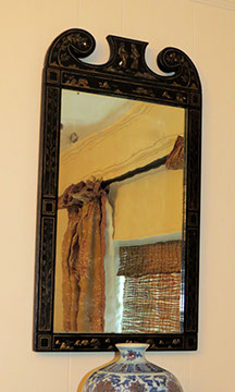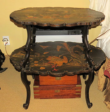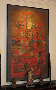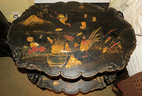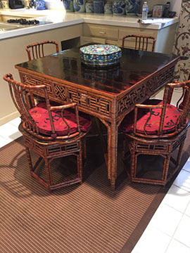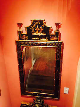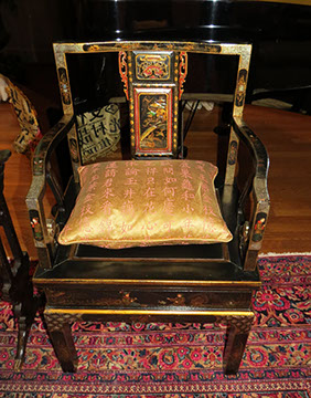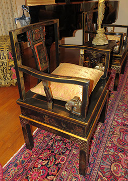 Black Lacquer Baby Grand player piano, Schafer and Sons; Round English mahogany dining table, 72 inches, with birdcage pedestal; Set of eight dining chairs, hand painted and signed from Patina in Italy,”Italia Classico,” all armchairs; Three antique Chinoiserie nesting tables; Two camelback settees, one Baker Furniture, one Henredon; A pair of antique polychrome Chinoiserie armchairs; French Victorian Dore bronze decorated and inlaid center table with pedestal base; Chinese Kang bed, elm; Wood framed Venetian tile and glass mirror; English made bamboo furniture; Tibetan chests; Henredon dining set, including Duncan Phyfe style dining table, six chairs, server, and china cabinet; Red lacquer coffee table; Antique Lolly chair covered in Scalmandre fabric; Two-tiered Chinoiserie side table; Large carved wooden bookcase; Pair of Baker Chippendale style side chairs; Reproduction decorator lighting and mirrors; Sofas and loveseats; Henredon Campaign style cabinets.