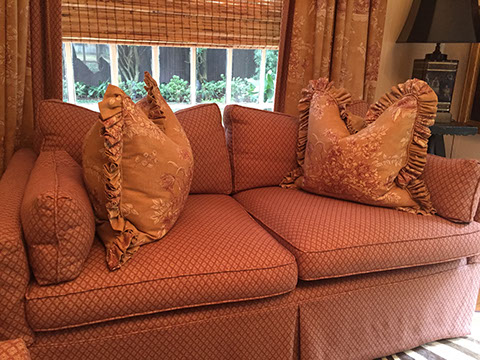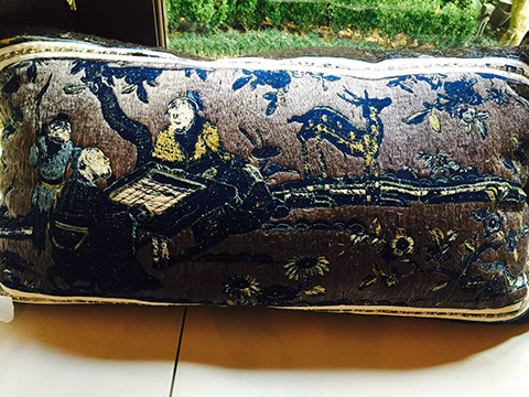 Mahal/Sarouk Persian room-size rug; Fabulous decorative pillows of Chinese embroidery, velvet, Scalamandre fabrics, and Turkish textiles; Chinese made Soumak rug; Table and lap linens; Black Gianfranco Ferre shawl from Paris Runway; Antique Persian area rug; Chinese Art Deco style room size rug; and many area rugs; Authentic zebra-skin rub, backed and edged.
