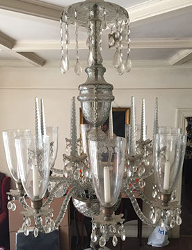 Antique 18th century crystal chandelier with eight candles, original crystals and hurricanes; Lalique stemware and figurines; Baccarat barware and figurines, vase; Steuben “Stardust” old-fashioned glasses and decanter; Waterford; Daum “Corail” stemware; ABC glass; Pairs of crystal and brass sconces; St. Louis “Thistle” decanter and stemware; Set of 12 Murano wine glasses