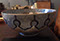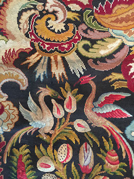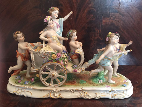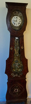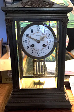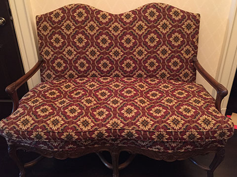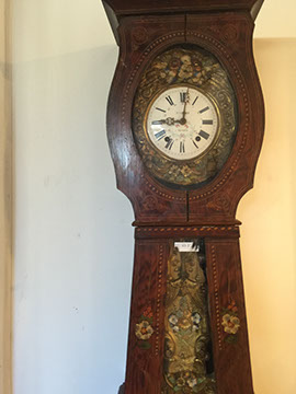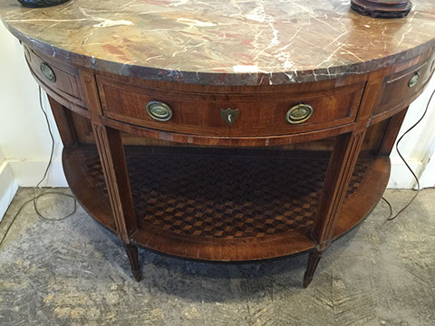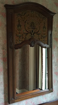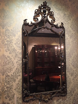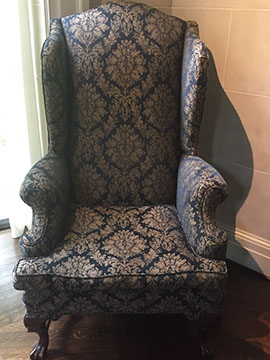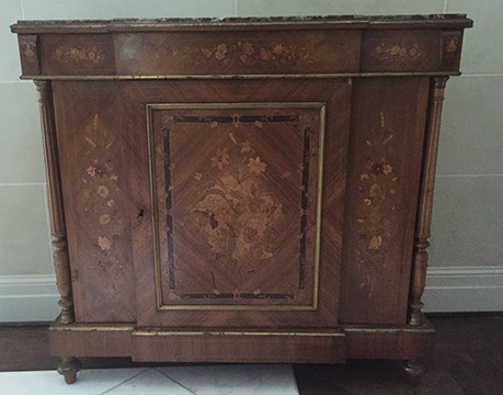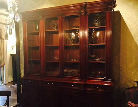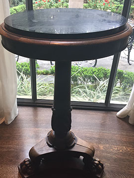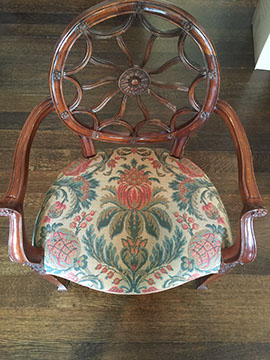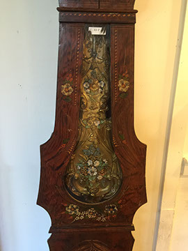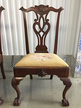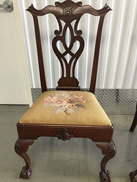 Pair of Antique Strap-Scrolled Chairs from the Yarnall Homestead, Germantown, featured in the first book on American Philadelphia furniture, PL # 331; Period 18th century English banquet table; Set of six George III dining chairs; Three French chairs and one ottoman covered in Fortuny fabric; Set of 8 Queen Anne Kindel Winterthur reproduction dining chairs; Set of English Centennial Chippendale style dining chairs; American Empire mahogany buffet; Marble topped matching pair of French inlaid buffet servers; English Secretary bookcases, dining tables, banquet tables, occasional tables; English tall clocks; Set of six spider back dining arm chairs; Suite of four Chippendale style dining chairs; Mahogany inlaid oval breakfast tables on pedestal base; Day beds; Wooden tea caddies; “Encased Wag on the Wall” French tall clock with inlaid case and ornate painted brass pendulum; French gilt wood mirrors; Venetian glass mirror; Pair of painted wood ornate mirrors; French Empire style daybed; Pair of Russian papier mache inlaid chairs with Mother of Pearl and gold leaf paint; Papier Mache tray table; antique blue and white Chinese lamps; Decorative lamps; Drop leaf oval harvest table, seats ten; Painted furniture; Corner cabinets