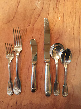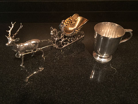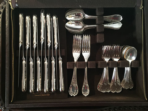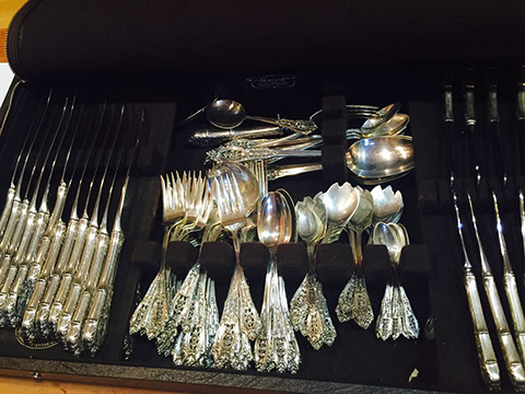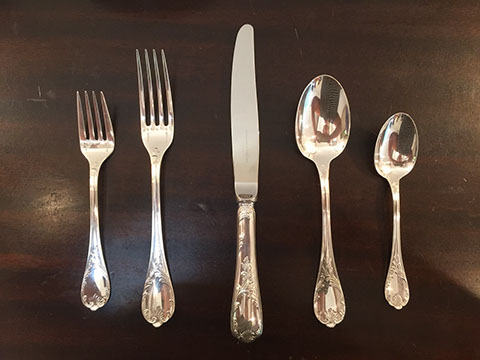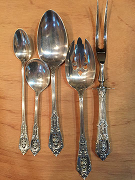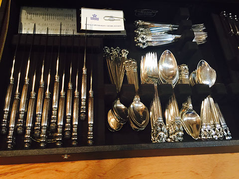 Sterling silver flatware: Georg Jensen “Acorn” table service, 17 12-piece place settings, 204 pieces; Wallace “Rosepoint” sterling, 20th century; Kirk Steiff; Silverplate three tiered server; Christofle “Vendome” silver plated flatware, 20th century; Large, chased silver plate tray with two handles, suitable for tray table; Set of four heavy plate graduated serving trays; Holloware
