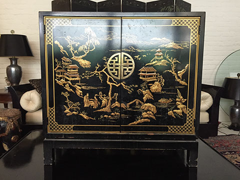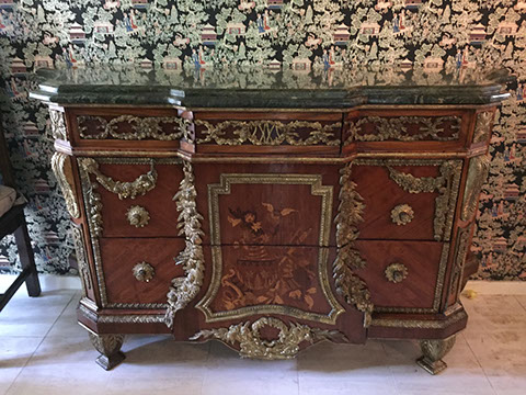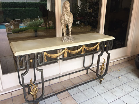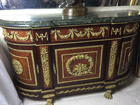 Henredon dining room chairs and table in country French style; Two French Empire chests with green marble dore bronze mounts; French style curio cabinets; Tables; Two Italian style marble top console tables; Art Moderne day bed; Chinese style furniture; Painted cabinets; Country two door pine cupboard; Slant front desks; Partners desk; Victorian arm chairs; Country French arm chair with needlepoint seat and back; Leather covered game table; Baker coffee tables; Designer lamps; Wing back chairs; Sofas; Lighting; Chinese style dining room table; English inlaid mahogany side board; Painted furniture; Garden furniture and accessories