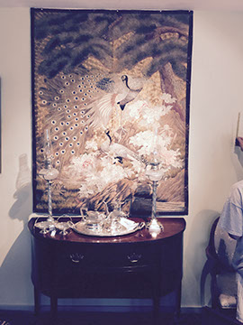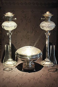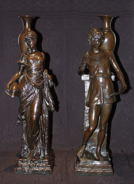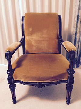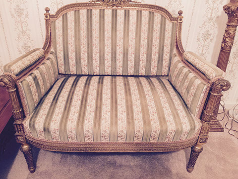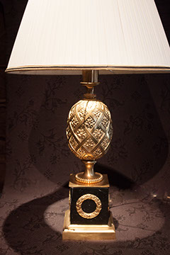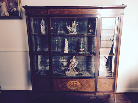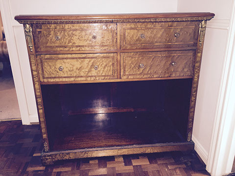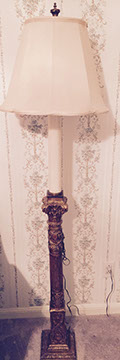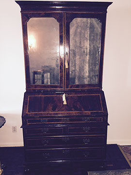 Two English Empire servers both having inlaid petticoat mirrors at the bottom; French inlaid satin-wood curio cabinet; Antique English mahogany sideboard-George III style; a matching pair of English French-style curio cabinets with the original paper labels signed Howard & Sons, London; Lamps: Chinese Bronze, Sevres & Dresden; pair of matching silver plated English candlesticks with a pair of matching cut-glass oil fonts; decorator lamps and mirrors; a French Victorian love seat; French statin-wood four-drawer chest; French Empire side chair from the Aesthetic Movement; Chinese hand-carved furniture; double-pedestal English mahogany dining room table with two leaves Duncan Phyfe style circa 1890; suite of 8 matching dining room arm chairs attributed to Biedermeier; Victorian mahogany mirror-backed English music cabinet; mid-century modern oval double-pedestal writing table; designer bedroom furniture, desks, upholstered furniture; many items too numerous to mention.