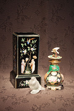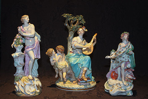 Collection of Meissen figurines; Nymphenburg porcelain; Sevres porcelain; Chinese Export porcelain; Mason’s Ironstone; KPM porcelain plaque with an allegory of Spring, scribed on verso: Fruhlingsknopsen (Spring Buds), after Koppa, with impressed scepter and monogram mark; Chinese carved wood porcelain inset fire screen; Imari porcelain lobed bowl; enameled music box in the shape of a grand piano; Petitpoint portrait – Girl of Flowers; Japanese and Chinese Cloisonné; Japanize signed Cloisonné vase with koi; signed Chinese porcelain plaque; French Lemerle Charpentier clock suite; Jacob Petit porcelain clock; Japanese and Chinese ivory; Mason’s Ironstone by Geoffrey Godden; Rose Medallion; Chinese carved wood and ivory fire screen; a hand-carved Russian amber jewel casket; collection of shells covered in silver; Dobbies limited inkwell made of ivory and 9 ct. gold; late Nineteenth Century Central Russian Icons; Meissen Compote; “The Pavlovsk Box”, made of various types of wood, MAMMONTH TUSK, AND ORMOLU, the box is inspired by the pavilions of Pavlovsk Gardens; a small collection of Daguerreotype; Copeland Jasperware; Papier mache Chinese nesting boxes; Majolica; Sarouk 10 ft x 14 ft. oriental rug Ca.1910; large and important Bisque figure of Beatrice; matching pair of Girandolas; Murano glass lamp; signed Chinese porcelain fine vases. TABLE AND LAP LINENS.