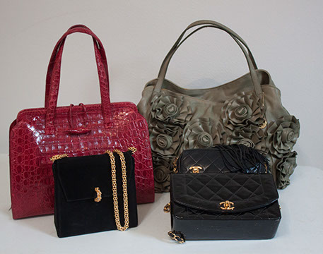 Emilo Pucci, Jacques Fath, Michael Casey, Sussman, Yves St. Laurent, Chanel, Fe Zandi, Scaasi, Bob Mackie vintage, Armani, Hermes, Black Iridescent Feather Collar. Handbags by Chanel, Gucci, Judith Leiber, Louie Vuitton, Nancy Gonzales, Paloma Picasso, vintage Alligator. Belts by Chanel, Celine, Gucci, ladies fine Concho. Evening Scarves.