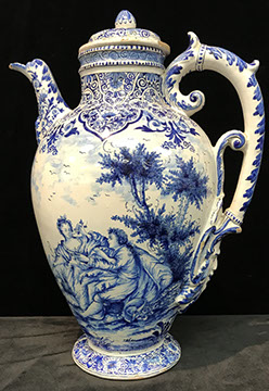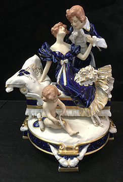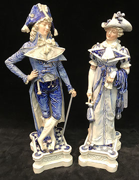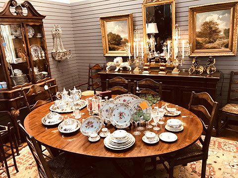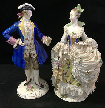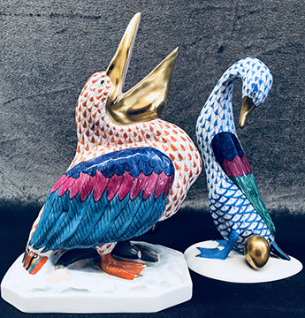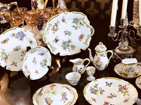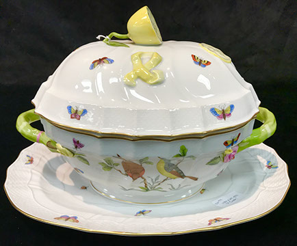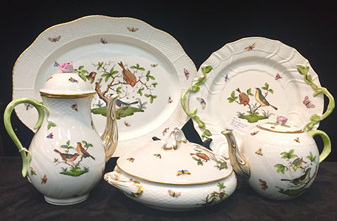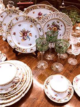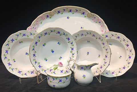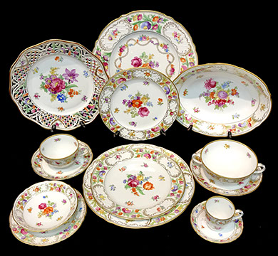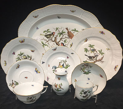 Twelve Meissen China Service Plates, Schumann “Dresden Flowers” Dinner Service, Limoges, Herend: “Victoria” Breakfast Set, “Rothschild Bird” Dinner Set, “Blue Garland” Breakfast Set; Rosenthal “Sansscouci” Dinner Service; English Minton Oriental Pattern Signed & Numbered; Rose Medallion; Royal Crown Derby “Royal Pinkston Rose” Tea Set, Royal Crown Derby “Old Imari”; Aynsley: “Leighton” Dinner Service, “Buckingham” Demitasse Cups and Saucers; Hutschenreuther “Monarch”; Spode “Buttercup” Dinner Service; Ginori Dinner Service; Imari; Coalport; English Transferware; Royal Doulton; Flow Blue; Wedgwood Jasperware; English Ironstone; Stencilware; Chinese Export; Italian Hand Painted Pottery; Chinese Celadon; KPM Copley; Lenox; Theodore Haviland for Limoges; Royal Worcester; Majolica; Early 18th Century Delft Jug with Lid; Staffordshire Figures; Dresden; Royal Dux Figurines.