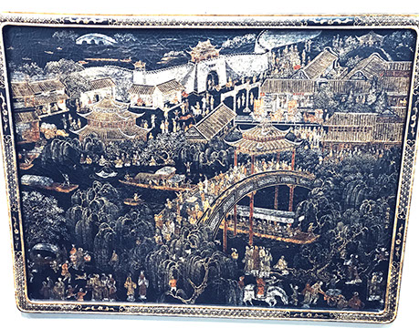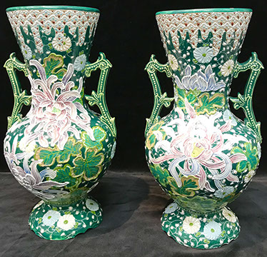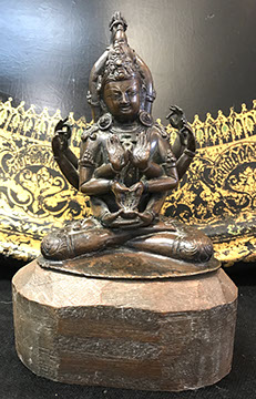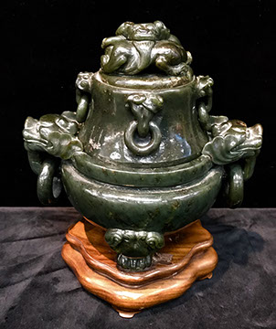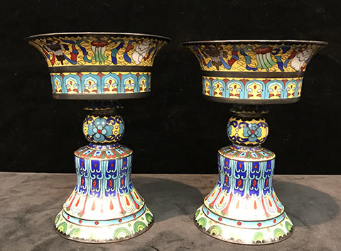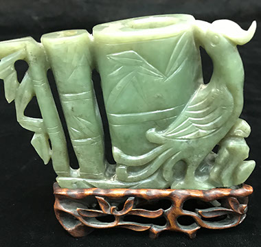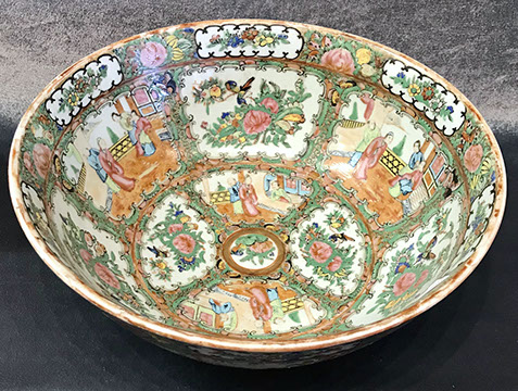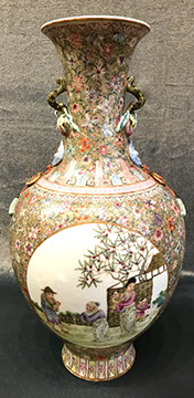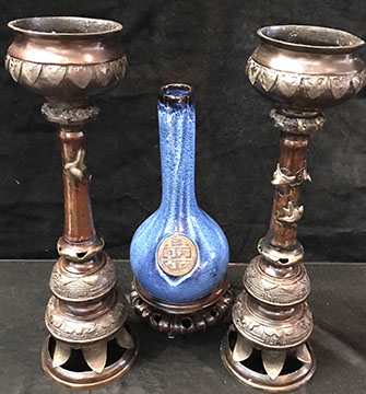 Rose Medallion, Imari, Chinese Export, Chinese Celadon, Gayageum Asian String Instrument, Twelve Panel Oriental, Screen, Four Panel Chinese Screen with Inlaid Semi-Precious Stones, Hand Carved Oriental Headboard over Padded Silk, Chinoiserie Backgammon Table, Chinese Chippendale Style Chinoiserie Cabinet, Chinese Chippendale Sideboard with Chinoiserie Décor, Chinese Enamel Birds, Pair of Water Colors of Chinese Emperor and Empress, Jade Carved Censor, Carved Jade Vase with Conforming Stand, Pair of Tibetan Cloisonne Altar Pieces, Cloisonne Vases, Rose Medallion Lamp, Japanese Moriage Pair of Hand Painted Pottery Vases, Various Pieces of Champlevés, Cachepots, Temple Fruit, Ebony Wood Hindu Sculpture from Maas in Bali, 18th Century Siamese Bronze Hindu God, Carved Chinese Torchieres.