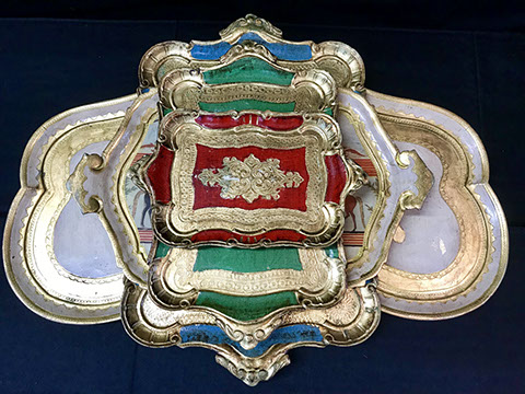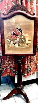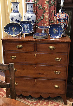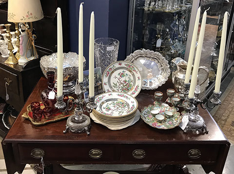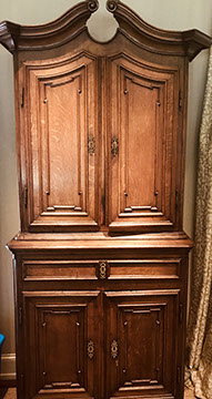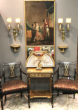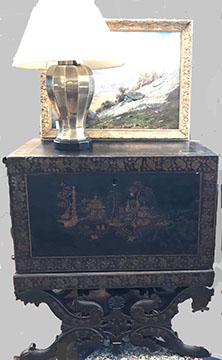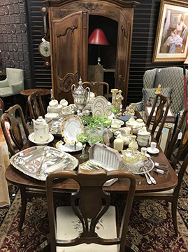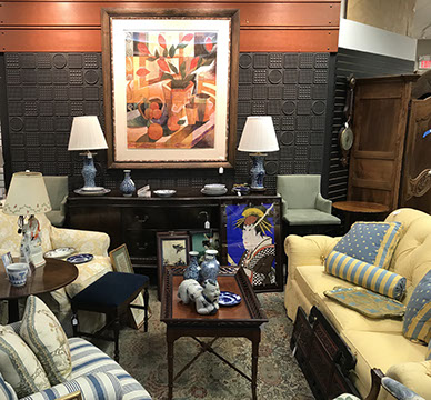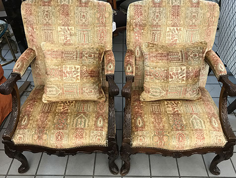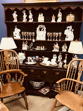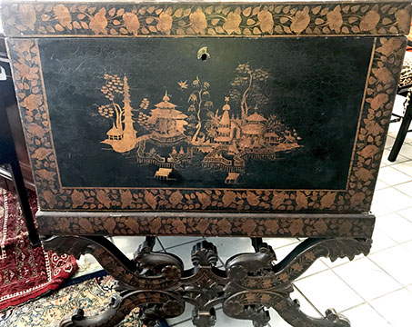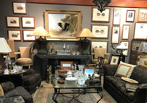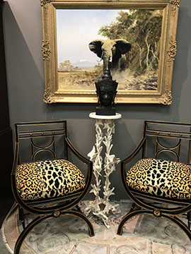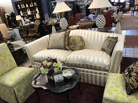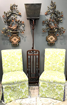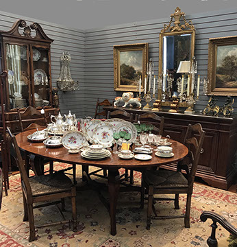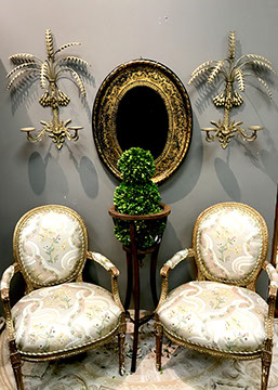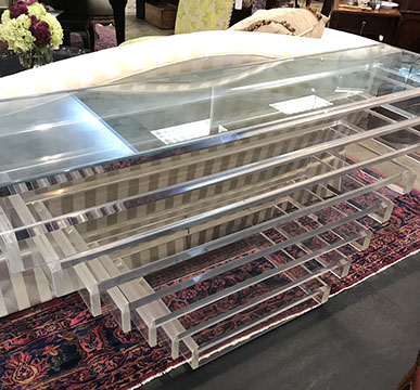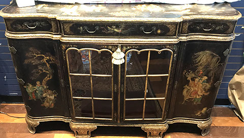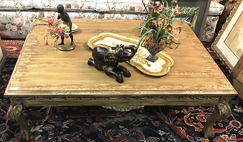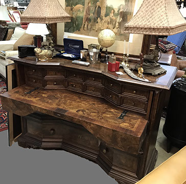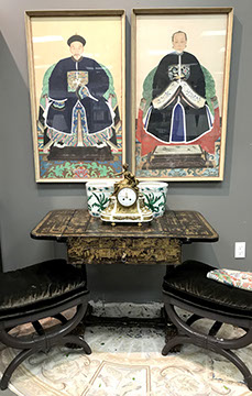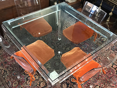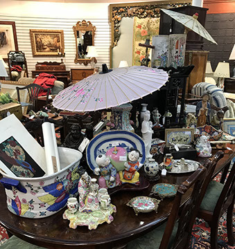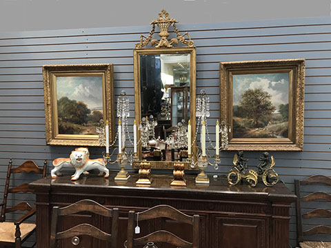 American & French antiques, Fine Upholstered Furniture, Mid-Century Modern, and Designer Furniture; Fine Leather Furniture, Victorian Bamboo Furniture, French Armoires, American Wicker Furniture, Hanging Wall Cabinets, Miniature Sideboard from Late 18thCentury with Two Wine Drawers, Dining Room Suites, Pine Country French Four Door Chest, English Stepback Cupboard with Original Handmade Hooks, English Chest of Drawers, Wrought Iron Stands Depicting Birds in Flight, Chinese Chippendale Style Chinoiserie Cabinet, Chinese Chippendale Sideboard with Chinoiserie Décor, Antique Chinoiserie Backgammon Table, Chinoiserie Chinese Caskets on Legs, Chinese Bamboo Cabinet, Lucite Table with Glass Top made by Merritt-Emanuel Ltd. (very hard to find), Lucite Chairs “La Marie” by Stark for Kartel, Lucite Sideboard, English Secretary, Oval English Dining Table, Victorian Table from the Aesthetic Movement Attributed to the Herter Brothers, Round Black Marble Top Center Tables, Set of Ten High Backed Upholstered Chairs, Portable Prie Dieu, Tuxedo Style Sofa & Arm Chairs, Pair of Matching Fortuny Upholstered Chairs, Fortuny Upholstered Sofa, Tan Leather Sofa with Four Matching Club Chairs, Contemporary Velvet Sectional, Wrought Iron Bar Stools, English Period Hepplewhite Sofa with Six Leg, Ornate Handmade Shell Headboard Commissioned by Mrs. McMahon, Lucite Headboard, Hand Carved Oriental Headboard Over Silk Padding, English Breakfront Style Entertainment Cabinet Made Specifically by RCA, Baldwin Grand Piano, Chickering Grand Piano in an Ebony Case, Pair of Giacometti Inspired Mid-Century Modern Handmade Gold Plated End Irons, Matching Pair of Persian End Irons, French Chenets, Canon Style Brass Coal Scuttle, Faux Painted Corinthian Column.