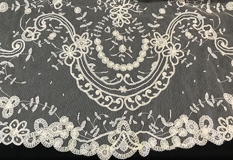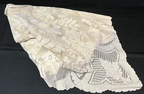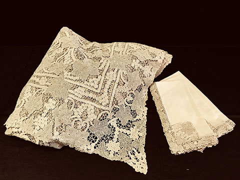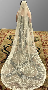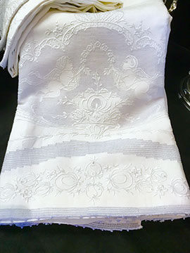 Fine Collection of Table, Lap & Bed Linens, Draperies, Quilts, Decorator Pillows, and a Chapel Length Embroidered Tulle Veil with Scalloped Princess Edging.