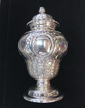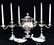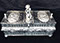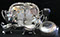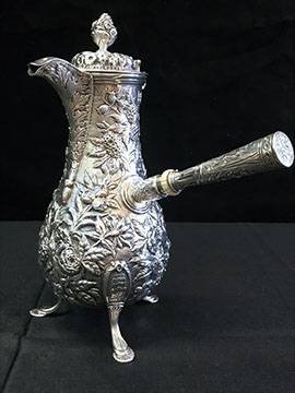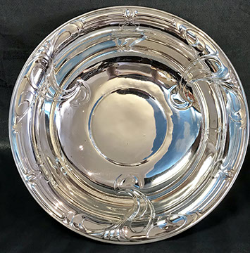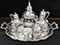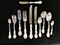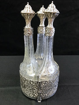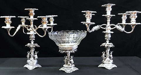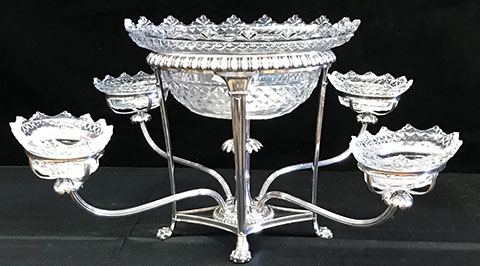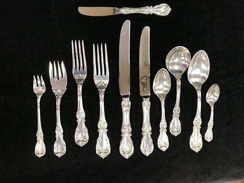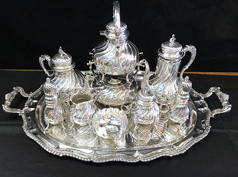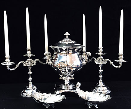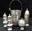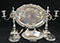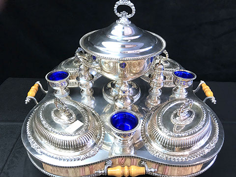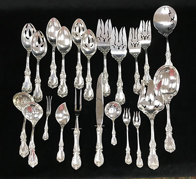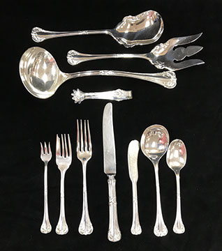 Two Large Important English Silver Plate Lazy Susans; English Wine Bottle Cruet with Russian Cut Bottles; Pair of Dutch Silver & Crystal Compotes; Sterling Silver Candlesticks & Candelabra; Period English Sterling Silver; Dutch Silver; A Fine Collection of Sterling Silver Hollowware, Tea Services, Water Pitchers, Muffineers, Serving Pieces, & Bowls: Tane, Tiffany, Georg Jensen, Sanborn, Christofle, Sheffield, Kirk Repousse; Sterling Silver Flatware: “King Richard” by Towle, “Candleglow” by Towle, “Louis XIV” by Towle, “Chateaux Rose” by Alvin, “Décor” by Gorham, “Daffodils” by Rogers Brothers, “Nupcial” from Monterrey, “Serenity” by International Silver, “Royal Danish” by International Silver, “Old Lace” by Reed & Barton, “Burgundy” by Reed & Barton, Georg Jensen“Acorn" Carving Set; Mother of Pearl Handled Sterling Pieces and Fish Sets; Silver Plated English Turkey Cover with Underplate; Important Pieces of English Silver Plate.