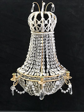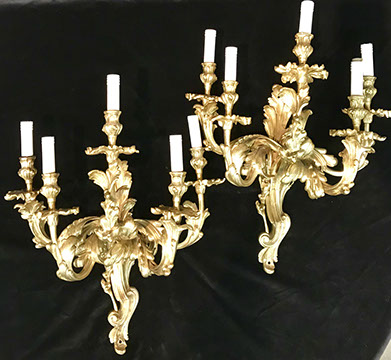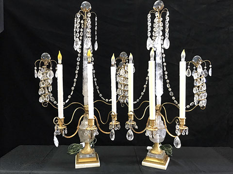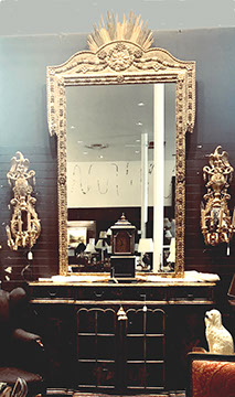 Mirrors: Pier Mirror Gold Leafed with Sunburst Décor, Octagonal Beveled Venetian Mirror, Antique Gilt Wood Rectangular Beveled Mirror, Pair of Gilt Wood Sunburst Mirrors; Lighting: Pair of Matching Three Light Gold Leaf Wood with Eagle Motif Sconces, Pair of Brass and Hanging Crystal Sconces, Raw Crystal and Dore Bronze Torchieres, Suite of Four Heavy Brass French Foliate Five Arm Sconces, Carved Chinese Torchieres; Several Sets of Acrylic Lamps, Staffordshire, Pair of Waterford Table Lamps; Pairpoint Table Lamp; Corinthian Column English Candlestick Table Lamps; Rose Medallion Table Lamps; Various Designer Floor & Table Lamps; A Collection of Fine Chandeliers, Dore Bronze and Alabaster Chandelier; Clocks: Tall Clocks & Wall Clocks, Acrylic Mantle Clock, French Boudoir Clock.