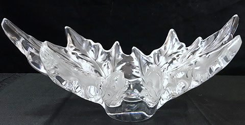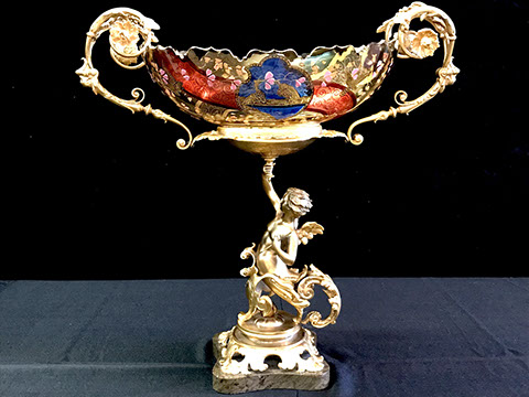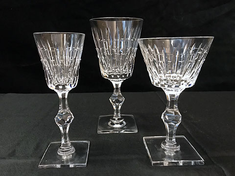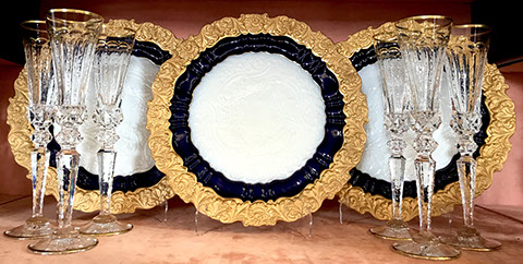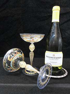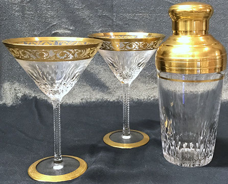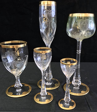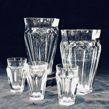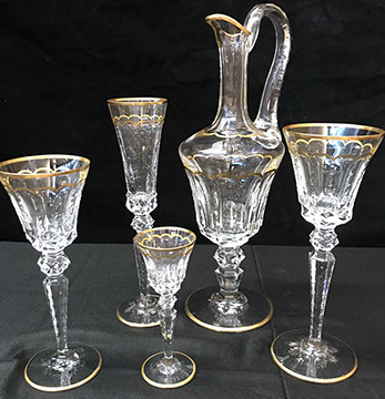 Bohemian Clear-Flash White & Blue Overlay Cut to Clear and Enameled Glass Ewer (reference Christie’s Lot no. ?), French Dore Bronze Cherub Holding Art Glass Bowl, Moser Deep Ruby Liquor Set, Tiffin, Saint Louis“Essence” – 14 Champagne Glasses, 12 Continental Goblets, 12 Water Goblets, 12 Sherry Glasses, & a Water Jug Pitcher; Saint Louis “Thistle” Cocktail Glasses; Saint Louis “Stella Gold Band” Cocktail Shaker; Hawkes “Triumph” Stemware; Venetian Glass Champagne Flutes; Bohemian Ruby Cut to Clear & Cobalt Cut to Clear; Slovakian Silver Coated Glasses; Lalique: “Champs Elysees” Bowl, Crystal Trophy Sculpture Inspired by Katarina Witt, Amber Tortoise, Vases, Figurines; Baccarat: “Lagney Clear” Water Goblets, Oversized Wine Glasses; ReidelSommelier Burgundy Grand Cru Wine Stems; Sabino; Large & Important Pieces of Waterford; Murano: Antique Stemware “Iris” Pattern, Hand-blown Murano Flower Bowls in Gold & White; Tiffany & Co.; Collection of ABC Glass; Monumental Pieces of Steuben; Orrefors.