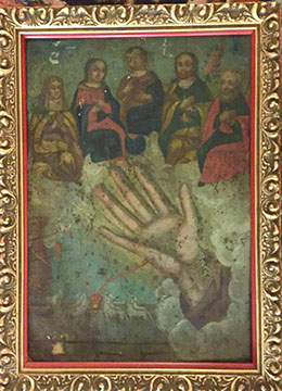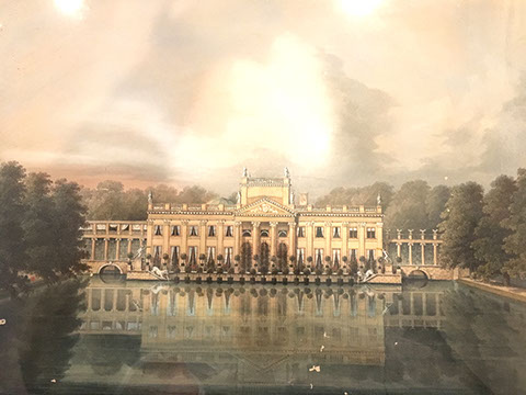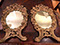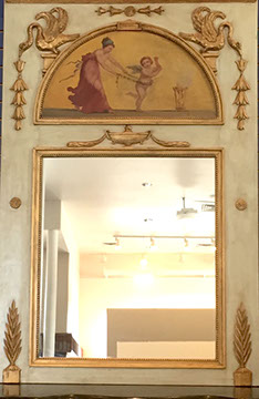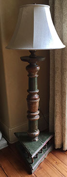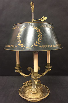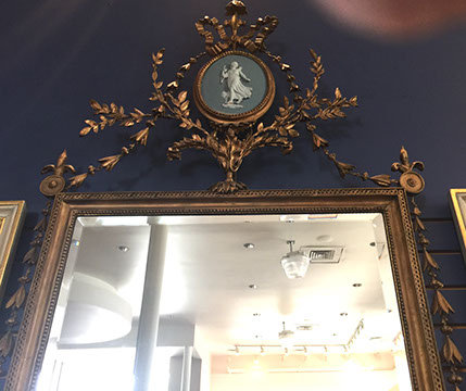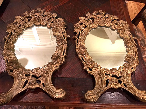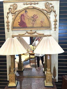 DECORATIVE ACCESSORIES AND LIGHTING: Decorator pillows, Celadon lamps, Venetian glass wall sconces, Diminutive pair of hanging French shelves with Sevres inserts, Numerous fine lamps of brass, bronze, marble, cast iron, porcelain; Many chandeliers of crystal, brass, wrought iron, stained glass; Many mirrors- oval and rectangular gilt, Chippendale style, Southwest style with inlay, carved wood, Gilt Trumeau with Wedgwood insert, painted Trumeau with French scene,