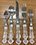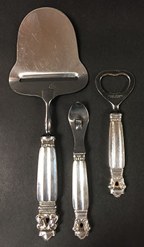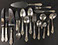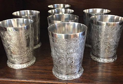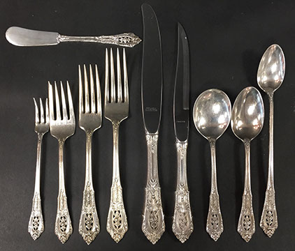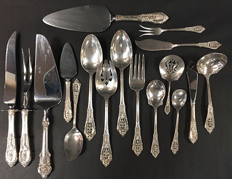 STERLING SILVER AND SILVERPLATE: Gorham “Décor” sterling flatware: twelve eight-piece place settings, Wallace “Grand Baroque” sterling flatware, 46 pieces, International Sterling flatware,” Angelique”, Reed & Barton six-piece sterling coffee and tea service, “Hampton Court”, Sterling silver hollowware by Gorham, Alvin, Randahl, and Wallace, Baker Ellis chased silver plate julip cups, Coin silver, Wallace “Rosepoint” sterling flatware,