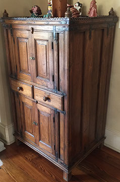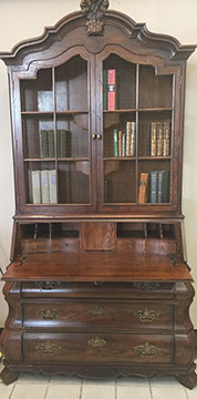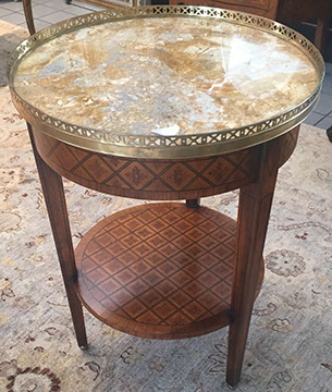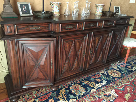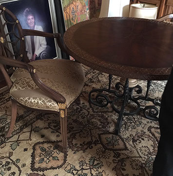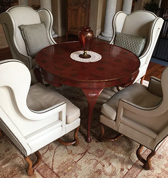 FURNITURE: French, English and American antiques; Traditional, Country French, Transitional, Garden and Mid-Century Modern; Set of ten Chinese red spider-back dining chairs; Mahogany cellarette, English lap desk; Chinoiserie style console/sofa table; a Pair of matching Bombay French cabinets with marble tops; Boston Hitchcock stenciled rocker; a Pair of Country French Bonnetieres; Signed Gunlock desk chair, Herman Miller desk; Anglo-Indian Campaign chest; Many pieces of painted and/or lacquered furniture; G.E. Redfield corner table; Pair of tufted leather sofas; Multiple sets of dining tables with chairs; Bookcases; Beds; Occasional table types: Pembroke, Dropleaf, Gateleg, Tavern, Side, Coffee, Game; Sideboards and Servers; Multiple sets of wrought iron garden furniture;