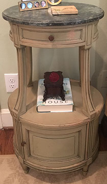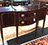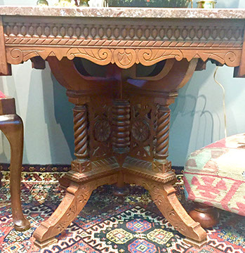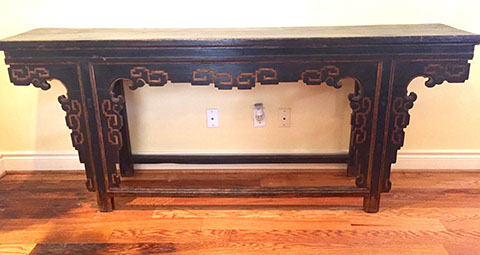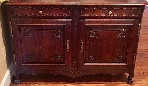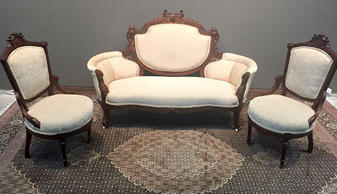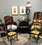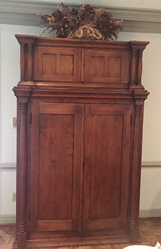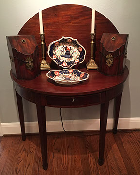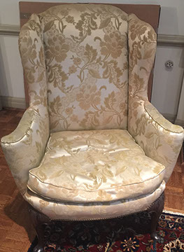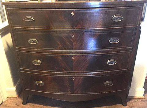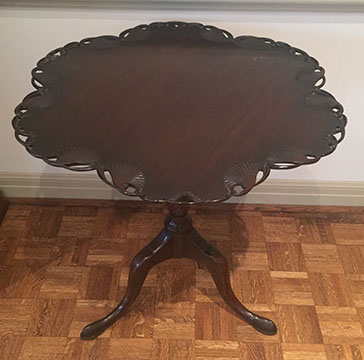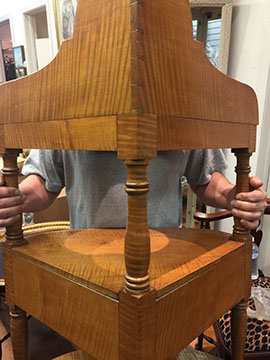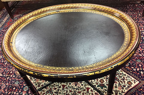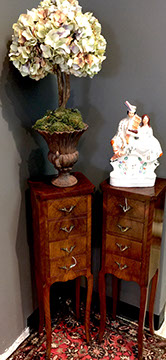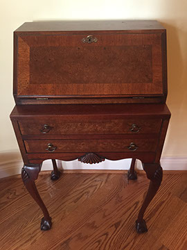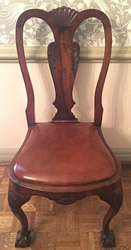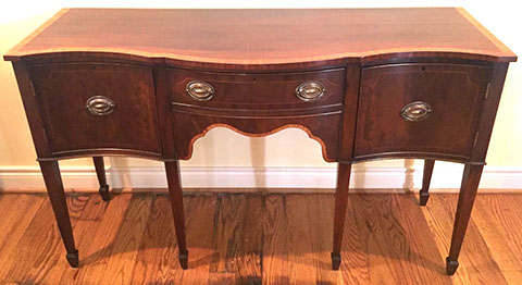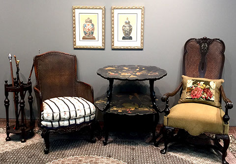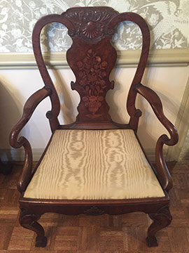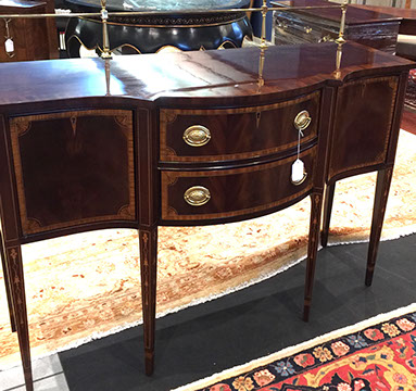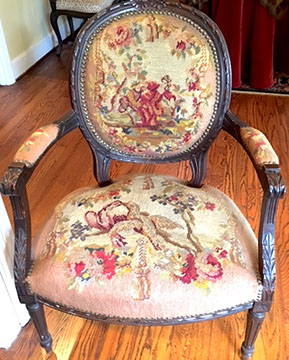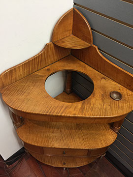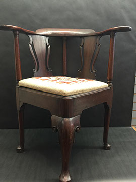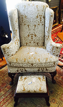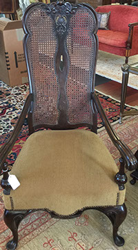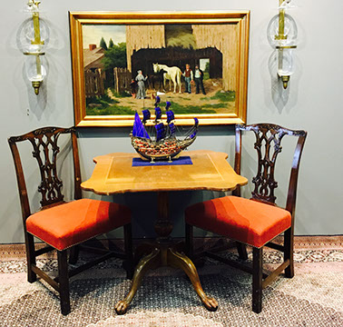 American, English and French antique furniture; Period American furniture: Mahogany Pembroke table with one drawer, c.1790-1810; Walnut and pine glass door cupboard, c.1870-1880; Windsor Armchair, Mahogany and inlay card table, Massachusetts c.1790-1810; Two piece wardrobe in tulip poplar, Ohio c.1830-1840; Triangular washstand in tiger maple with three shelves and drawer, c. 1825-1840; Drop-leaf table with single drawer, c. 1840-1850; Mahogany four drawer bow front chest of drawers, c. 1800; Gilded wood looking glass with central cherub & eagle flanked by birds on trees, c. 1810; Pair of shield back mahogany chairs, probably Maryland, c.1800; Period English furniture: Mahogany three section dining table on three urn pedestals, late 19th century;  Papier mache tray table, on wood base, c. 1820-1850; Mahogany and veneer on pine bow-front sideboard, c. 1780-1800; Walnut looking glass in two parts with molded frame,c. 1720-1740; Brass fender, steel & iron, c. 1800-1820; Wing back chair; Corner chair with needlepoint seat, c. 1750-1770; Walnut Queen Anne style arm chair, c. 1740; Queen Anne style side chairs with original leather seats; French Biedemeier style daybed with inlay; Country French table & matching chairs, Armoires, Sideboard; Mid-Century Modern furniture; Chinese Oriental furniture; High Victorian Eastlake table, Chest with marble top and matching mirror; Brass Andirons; Canopied four poster bed; French Buffet Tables;  English Oak Step back Welch Dresser; Game table with inlay, plaques and bronze accents; English Tall Clocks; Multiple Formal Dining Tables; Sets of Chinese and Queen Anne dining chairs; Mahogany sideboards; Needlepoint Berger Chairs; Lap desks; Zero Modern “Delfin” dining chairs; Empire daybed with inlay; Italian Louis Ghost chair by Kartell, design by Starck; Black Japanned furniture; Chinese Canton furniture; Leather Milo Baughman style tub chairs; Wingback chairs; Leather tufted ottoman; Coromandel screen; Antique framed German birth certificate; Antique framed sampler, dated 1828; Camelback & Sheridan style sofas; Six woven rattan dining side chairs; Painted headboards; Pair of Ebonied wall sconces; Garden furniture