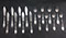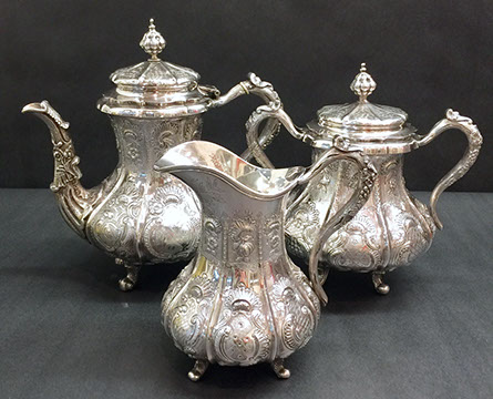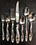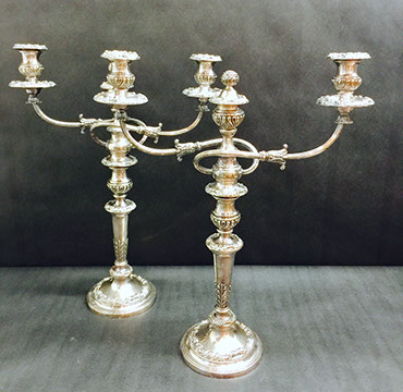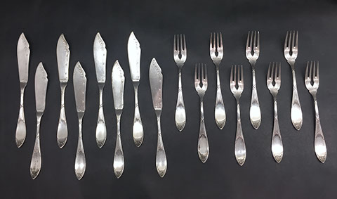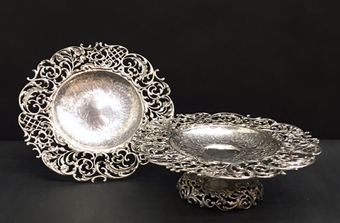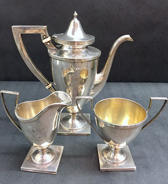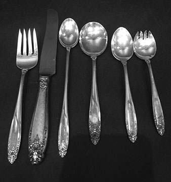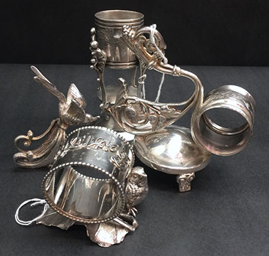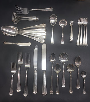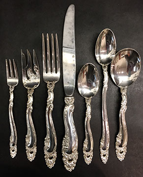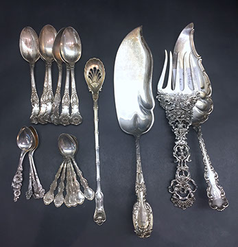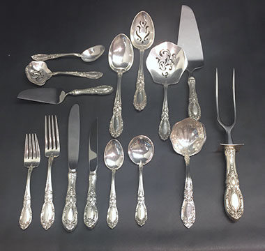 Sterling flatware:  Towle “King Richard” sterling flatware; Gorham Sterling coffee service; Tiffany Sterling 7” plates; Gorham Sterling Pitcher; Kirk & Sons Hollowware; Collection of Gorham serving pieces; Antique napkin rings; “Prelude” by International flatware; Hertzberg Jewelry sterling flatware; Sterling candelabra; Collection of antique sterling serving pieces; Sterling overlay seashells by Scully & Scully